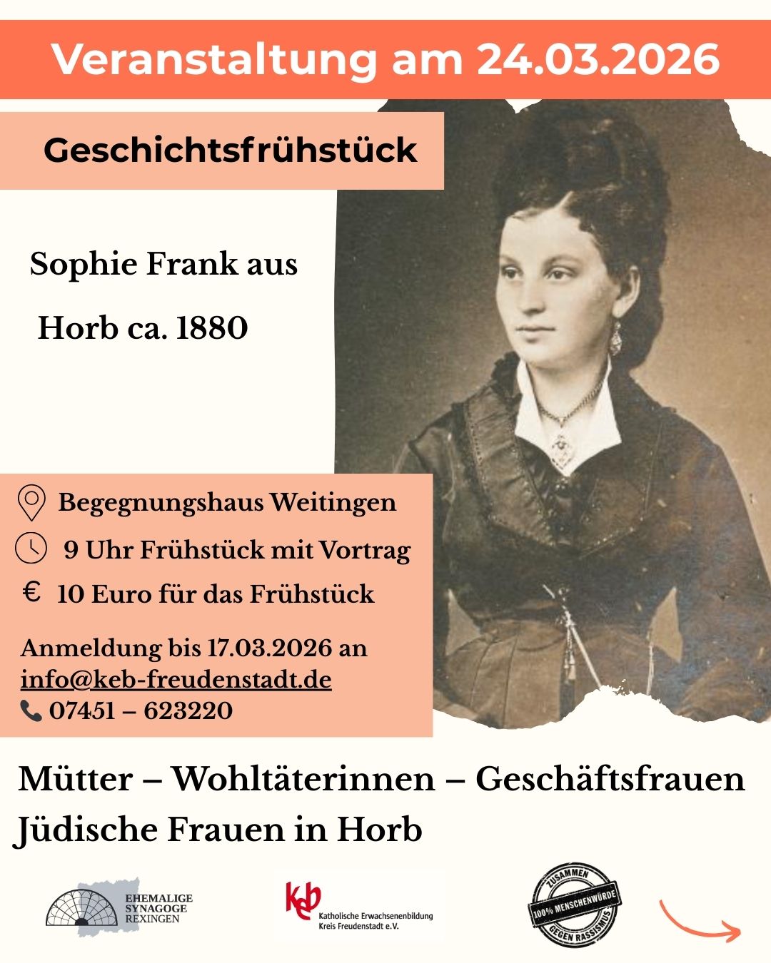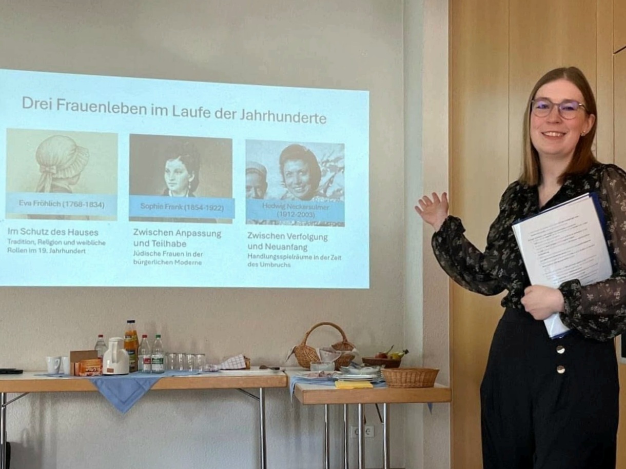 Im Rahmen der Internationalen Wochen gegen Rassismus bot der Synagogenverein in Kooperation mit der katholischen Erwachsenenbildung keb am 24. März 2026 ein Geschichtsfrühstück im Begegnungshaus in Weitingen an. Linda Huber, ehemalige Bildungsreferentin des Vereins, präsentierte einer sehr interessierten Teilnehmergruppe spannende Einblicke in 500 Jahre jüdisches Leben in Horb. Bis zur Zerstörung durch die Nationalsozialisten prägten jüdische Familien über Jahrhunderte das Leben in Horb. Der Vortrag folgte den Spuren jüdischer Frauen, die als Trägerinnen von Kultur, Religion und soziale Leben maßgeblich zur Blüte ihrer Gemeinden beitrugen - als umsichtige Mütter, engagierte Ehefrauen, erfolgreiche Geschäftsfreuen und Pionierinnen der Frauenbildungen.
