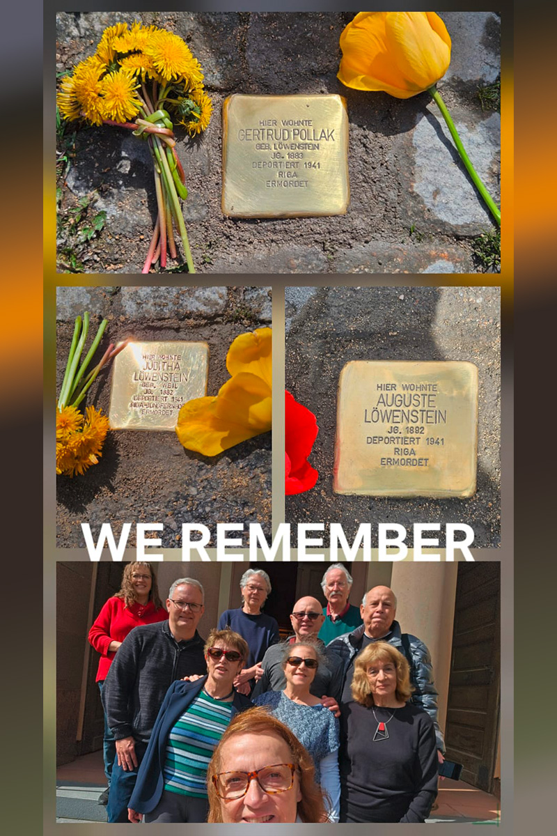 In diesen Tagen wird nicht nur hier in Rexingen erinnert. Weltweit gedenken Nachkommen und Angehörige der Deportierten ihrer Familien – oft weit entfernt, aber innerlich eng verbunden mit diesem Ort. Stellvertretend sei hier eine Nachricht erwähnt, die den Verein von Liliana Löwenstein aus Argentinien erreicht hat. Sie schickte eine Collage von der Stolpersteinverlegung am 29. April 2023, an der sie in Rexingen teilgenommen hatte mit dem Hashtag #WeRemember – wir erinnern.  Das Foto zeigt die Stolpersteine der ermordeten Frauen Auguste und Juditha Löwenstein sowie Gertrud Pollak geb. Löwenstein zusammen mit dem Bild des Besuchs in Rexingen gemeinsam mit anderen Nachkommen und Vereinsmitgliedern.